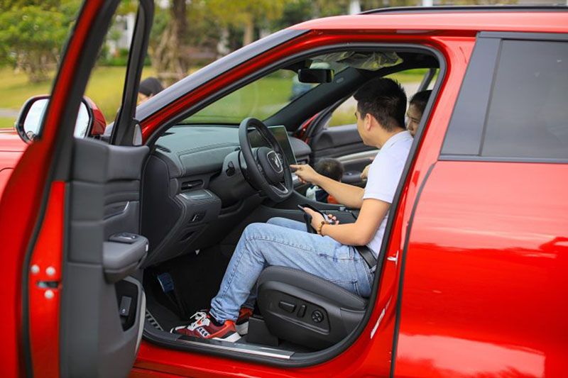 Anh Ngọc Dương ấn tượng với các tính năng công nghệ trên xe VF 9. Anh kể vể trải nghiệm du lịch đường trường cùng gia đình với VF 9, xe chạy đèo dốc “rất sướng, cảm giác rất an toàn”. Trước đây anh sử dụng một mẫu xe ô tô xăng nhưng khi nghe tin về chiếc xe VF 9 đi xuyên Việt, anh đã quyết định tìm hiểu và đặt cọc VF 9 chỉ trong một buổi sáng.